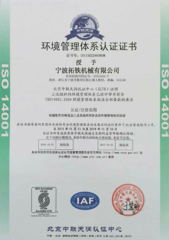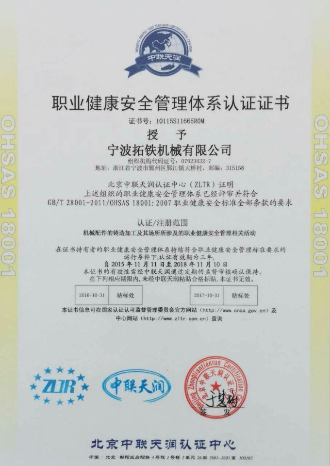 2015年11月,拓鐵機(jī)械獲得國(guó)家ISO9001質(zhì)量管理體系認(rèn)證,ISO14001環(huán)境管理體系認(rèn)證和OHSAS18001職業(yè)健康安全管理體系認(rèn)證。